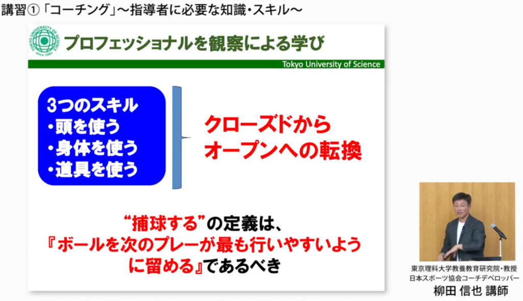 私から提案したいのは、クローズドからオープンへ転換することを考えて『捕球するって何ですか?』 と聞かれたら、補球することの定義は『ボールを次のプレーがしやすいところに持ってくる』。 これが捕球の定義であるべきだと。