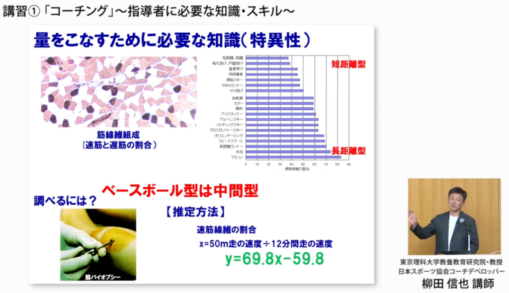 「筋線維組成と言って、我々の筋は瞬発的に動く筋と持久的に動く筋が混在してます。 多くの人は半々です。 トップアスリートの中には、特にマラソン選手なんかは遅い筋肉、持久的な筋肉が非常に割合が多いという方がいるという事実があります。野球選手はどうかというと、過去のデータで見ると50%です。つまり持久的でも瞬発的でもない、筋力を発揮するための構造としては一般的な人と変わらない人がトップアスリートになっています」