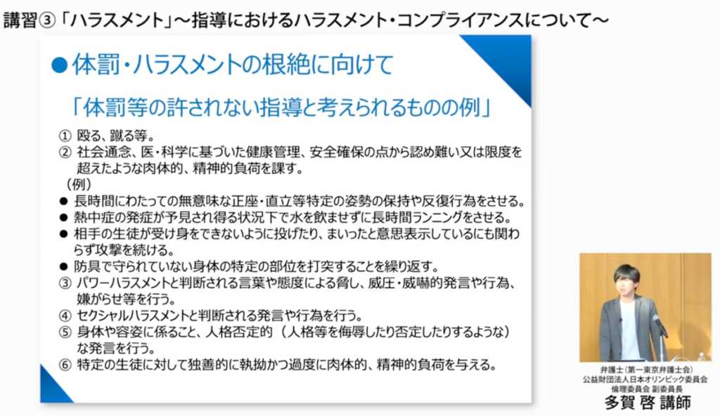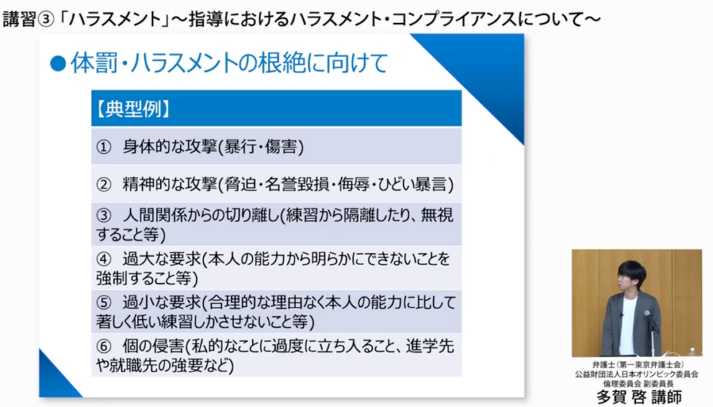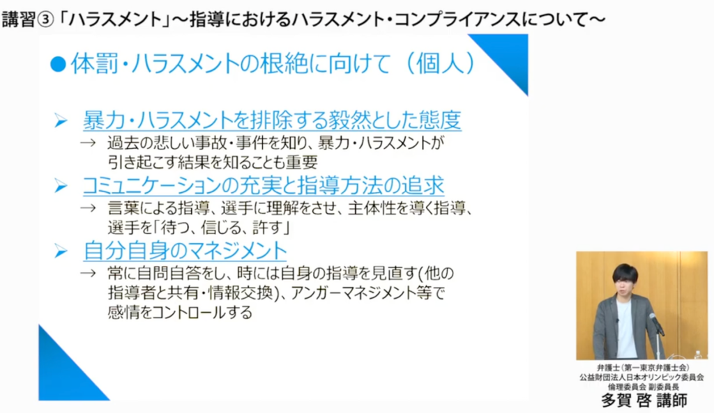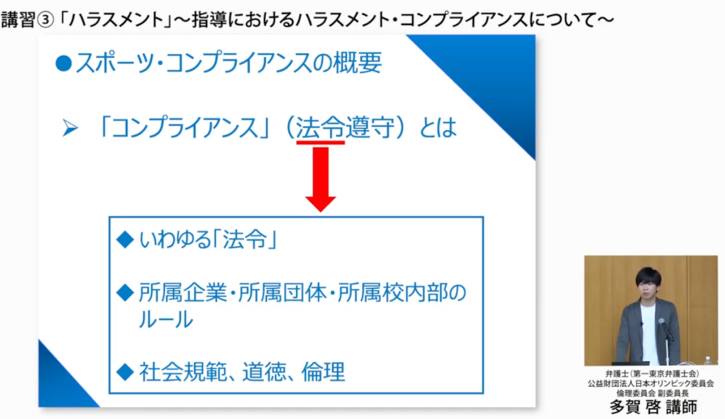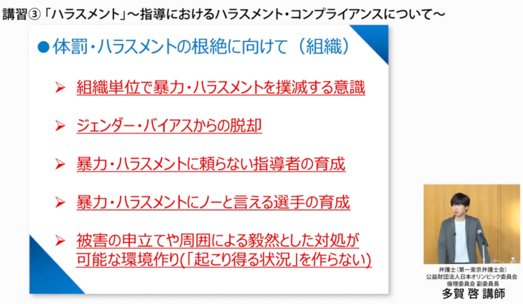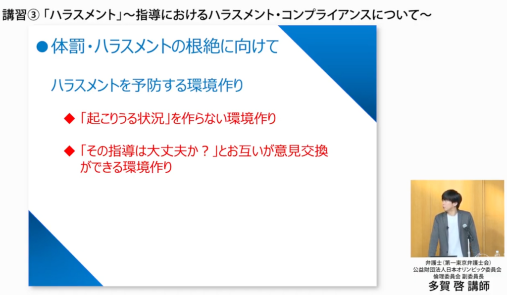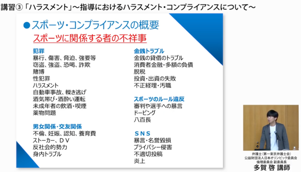 被害者になる方も加害者になる方も減らすというのが、スポーツコンプライアンスが求められる理由として非常に大きいものかなと思います」