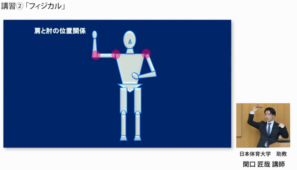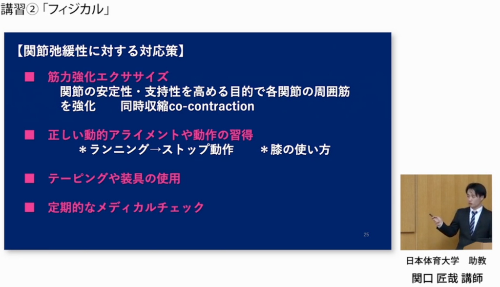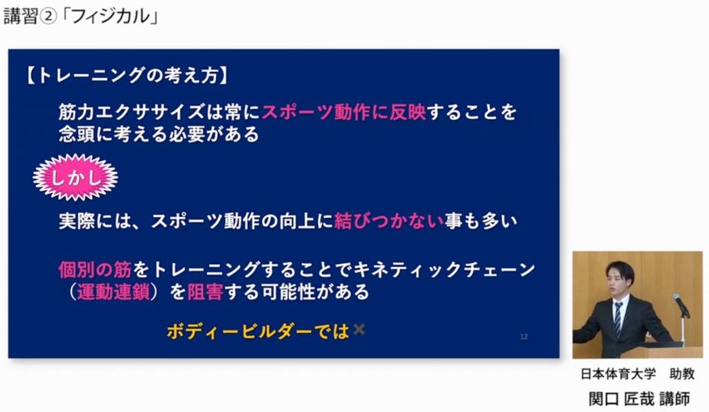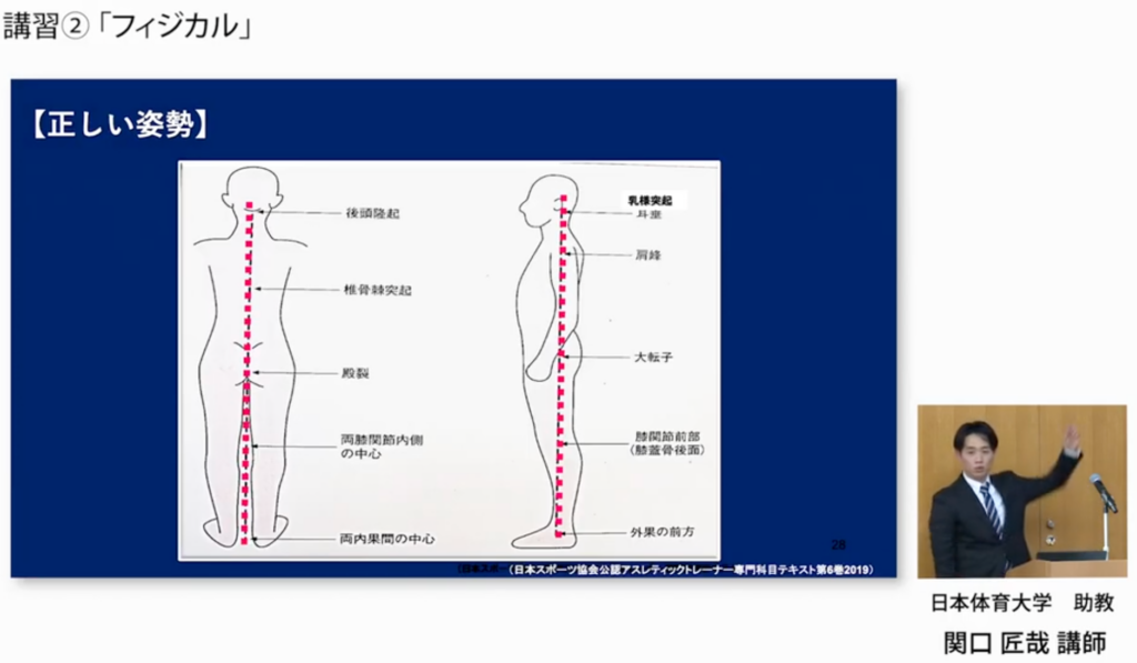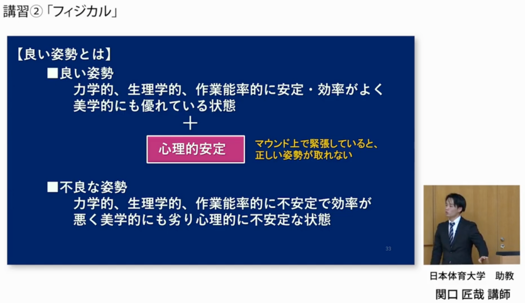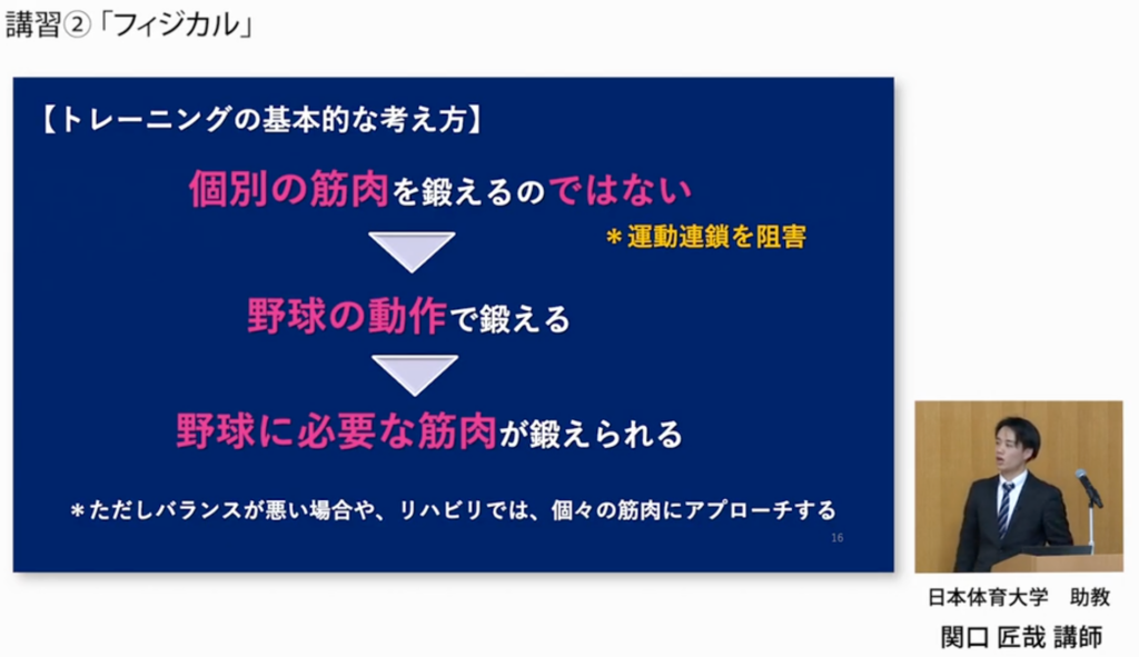 今回の講師は、日本体育大学の関口匠哉助教が担当。同大で元侍ジャパンヘッドトレーナーの河野徳良氏に代わり登壇した。