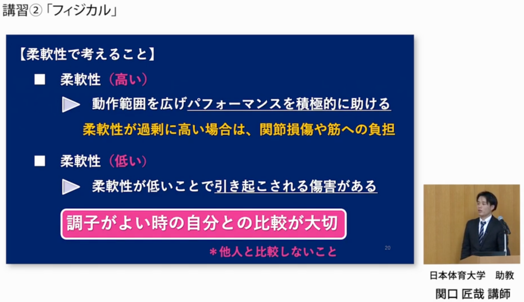 日本体育大学の関口匠哉氏が講師を務め、トレーニングの原理・原則、柔軟性、さらには指導現場で陥りがちな誤解まで、多角的な視点での解説が行われた。