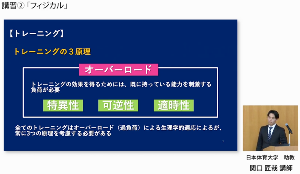 最初の「トレーニングとは」で関口氏は3原理・5原則を示し、「怪我の予防であったり、効率よくトレーニング効果を得られる考え方です」と述べる。