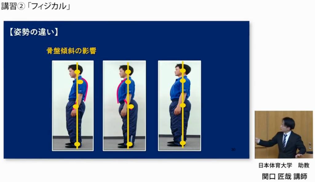 関口氏は姿勢について主に3つのパターンがあるとした。骨盤が斜め後ろに反れている姿勢が猫背気味、斜め前に倒れていると逆に胸が反れている形、そして真っ直ぐの姿勢に分けられる。※下図参照