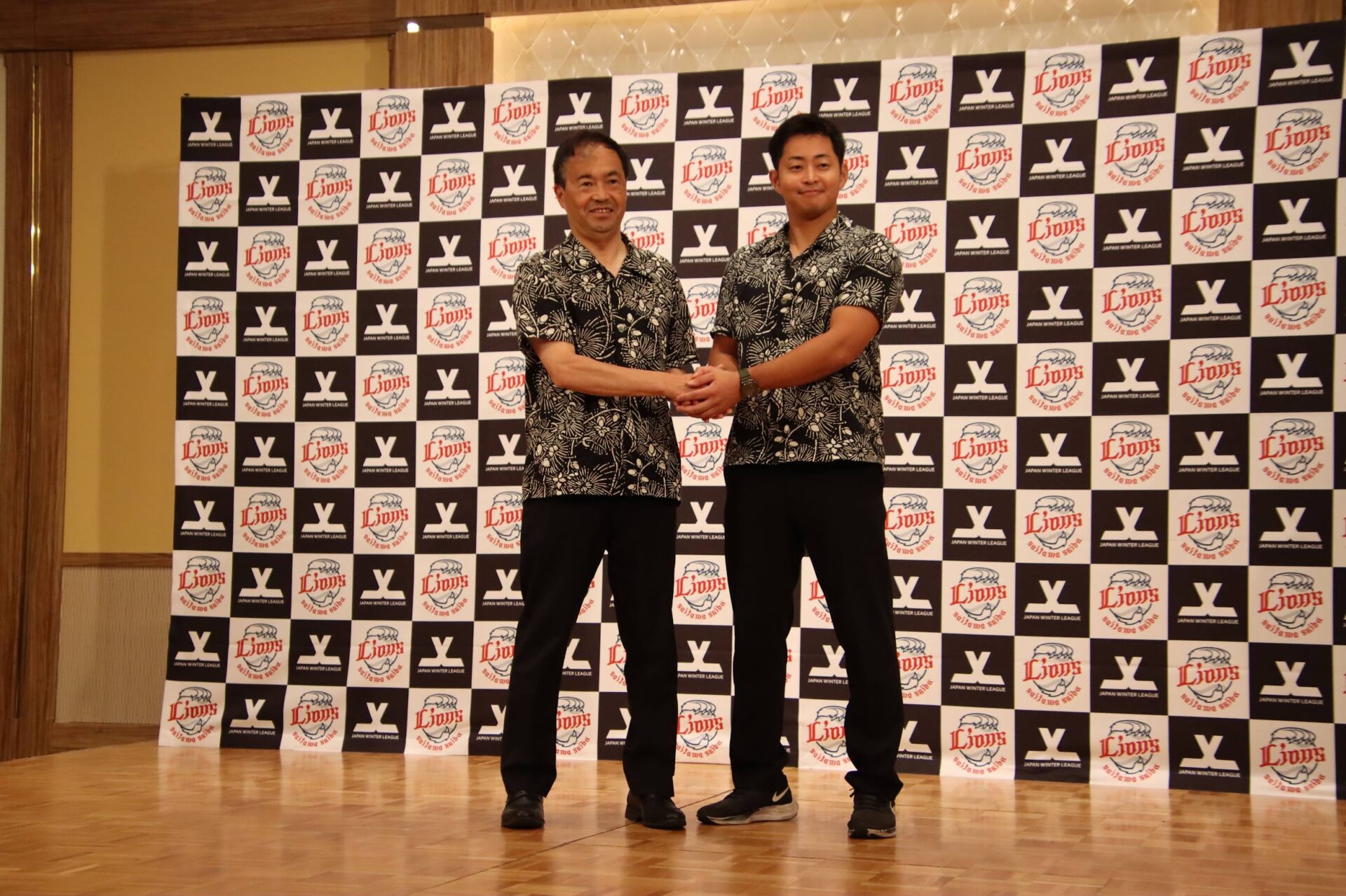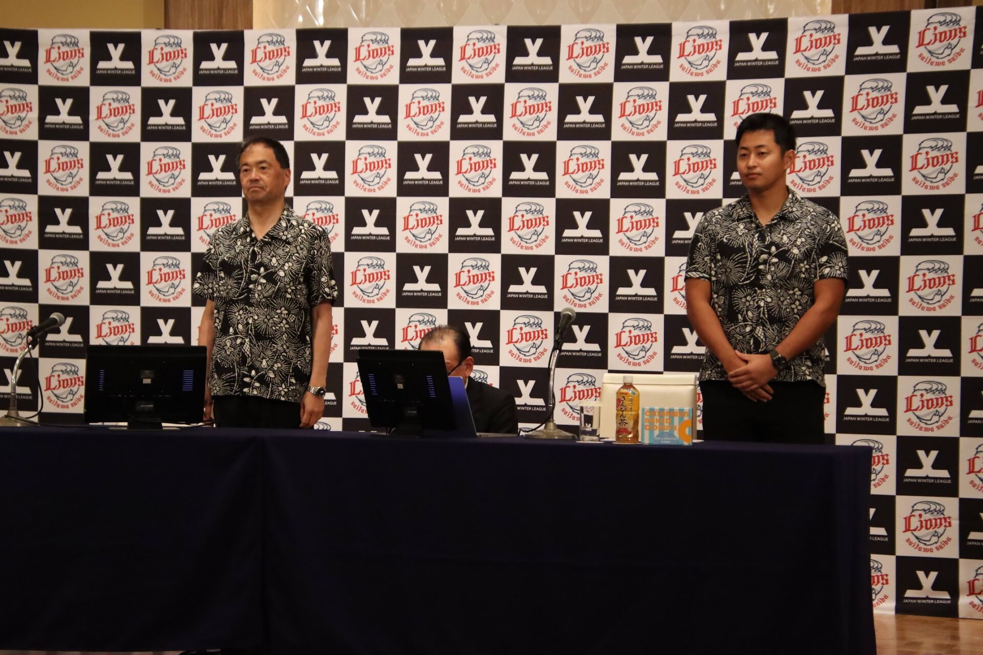 株式会社ジャパンリーグの鷲崎一誠 代表取締役と、株式会社西武ライオンズの飯田光男 常務取締役球団本部長が登壇し、今年の開催について会見を行った。
