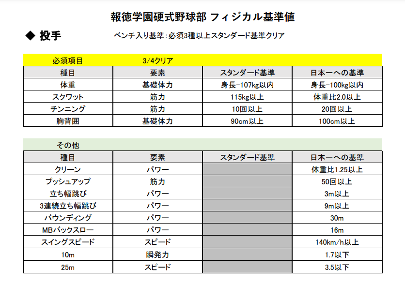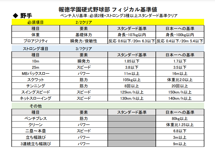 以下が報徳学園の選手たちに求めているフィジカル基準だ。「体重」と「プロアジリティ」は必須項目で、ストングポイントは7項目ある。