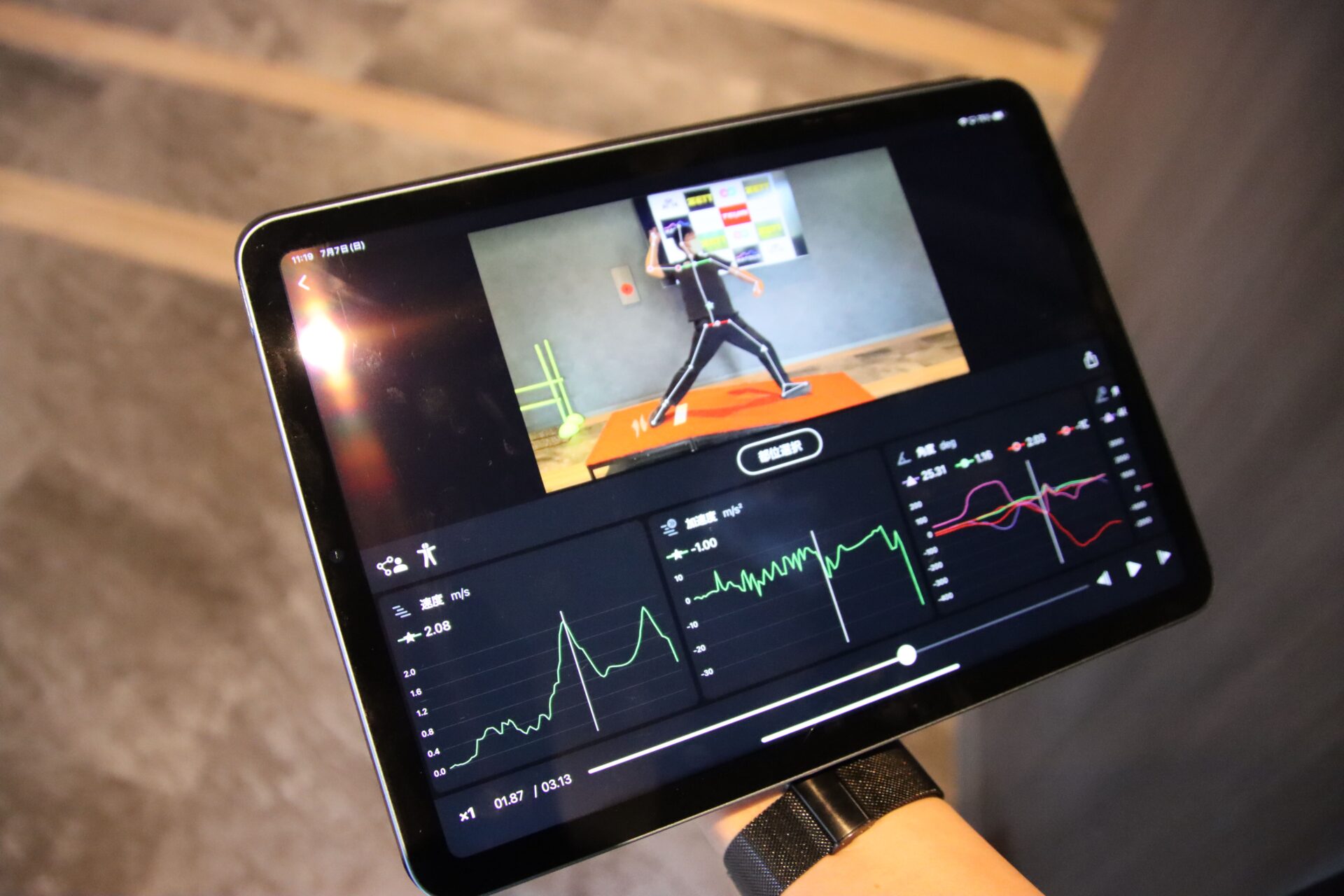 ブルペンでは、SPLYZA Motion(スプライザモーション)というマーカーレスでの動作解析が可能なアプリを用いる。設置したタブレットから撮影しその場で各関節の角度と加速度を計測することができるアプリである。