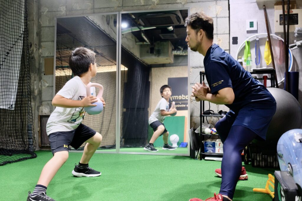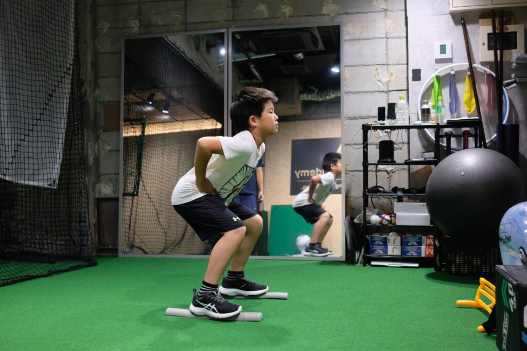 同施設はマンションの地下1階にあり、動けるスペースは50平米弱、高さは3m強。スクールは基本的にマンツーマン型で、小中学生が中心だ。同じ学童チームに所属する小杉君と五十嵐君は隔週で一緒に受講している。