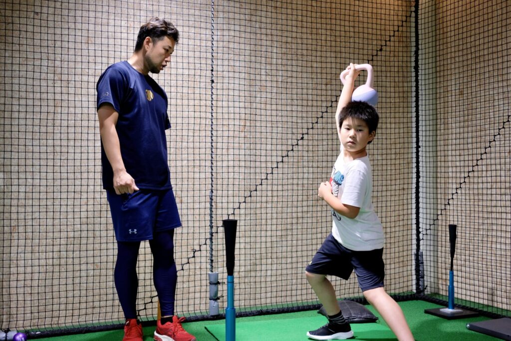 今度は右手でケトルベルを高く持ち、適切に支えられる場所を体で覚えていく。山本君はバットを持つと、収まりのいい場所で構えられるようになった。