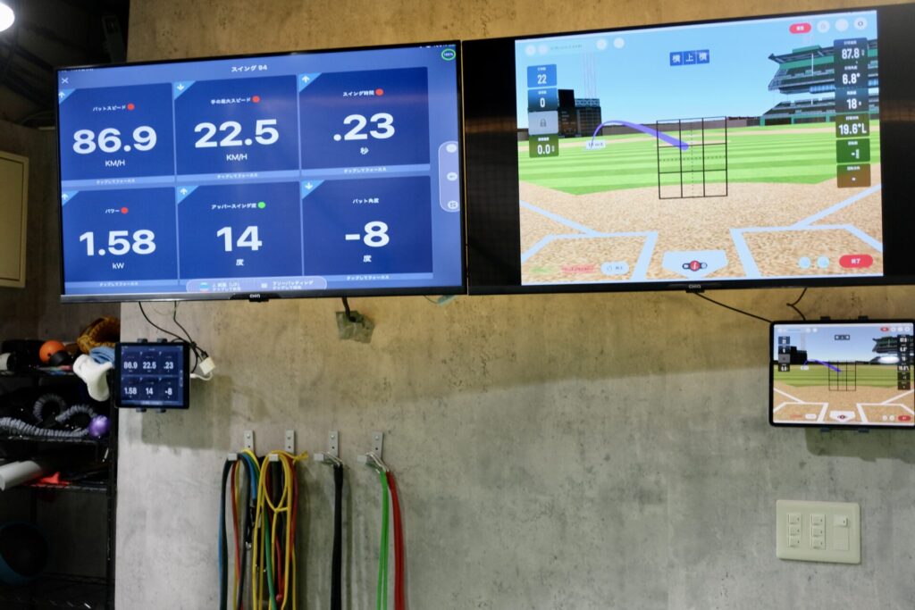 室内練習場にはラプソードが設置され、打球の速度と角度がモニターに表示される。バットのグリップには、スイング軌道などを可視化するブラストが装着されていた。