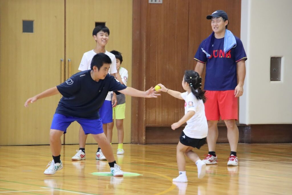 発案したのは東翔紀選手。大きくて投げやすいよう、キッズ用のハンドボールを導入した。
