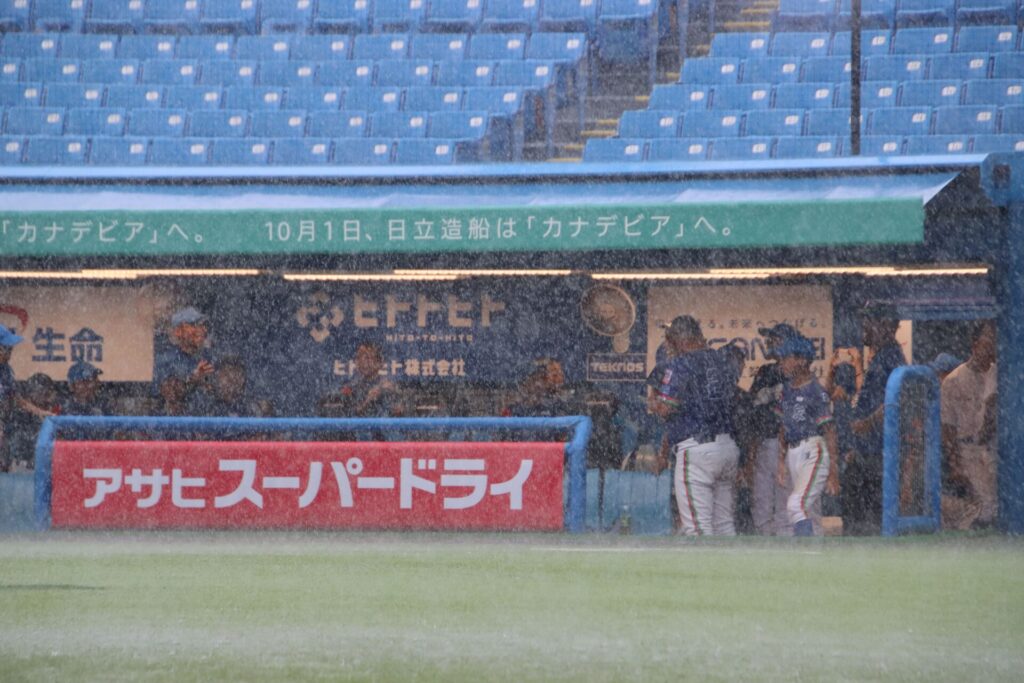 6回表にすでに降っていた雨が一段と激しくなり、途中で中断。約30分待機後、球審がコールし5回で試合成立となるコールドゲームとなった。
